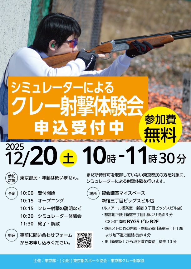 クレー射撃連盟 クレー射撃シミュレーター体験会 2025.11.27 東京都クレー射撃協会・東京都スポーツ協会の主催による、「シミュレーターによるクレー射撃体験会」が開催されます。 クレー射撃の簡単な紹介やクレー射撃にしようする銃の所持許可のステップなどの紹介も行われます。ホームページから簡単に申し込みできますので、ご参加ください。 チラシ PDFダウンロード 東京都クレー射撃協会「問い合わせページ」